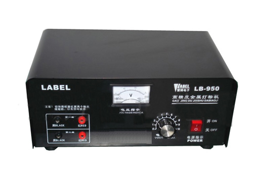 將機(jī)器電源線插入機(jī)器電源插座,并將電源線插頭入市電AC220V的插孔上,檢查兩根電極輸出線,確保未搭接短路后,按電源開關(guān)(POWER)上端至”開(ON)”的位置,開關(guān)指示燈亮?!昂谏保˙LACK)/“白色”(WHITF)”選擇鈕:在光亮金屬本色上標(biāo)注選“黑色”,在黑色金屬表面上標(biāo)注選”白色”,通常多使用黑色,將”黑色”端按下?!岸〞r(SETINGTIME)/手控“(HAND CONTROL)” 選擇鈕:在做大量重復(fù)工作需定時控制的標(biāo)注時,可選擇“定時” ,以保證良好的一致性;一般少量標(biāo)注時,可選擇“手控”較方便,先將“手控”端按下,“定時調(diào)節(jié)(TLME ADJ.)”鈕為在“定時”狀態(tài)調(diào)整定時間之用,調(diào)節(jié)范圍約在1-10秒?!半妷赫{(diào)節(jié)”鈕為輸出電壓調(diào)節(jié),選擇范圍在 0-20V之間,并由中間的“電壓指示”表指示實際值,其選擇應(yīng)與標(biāo)注材料、溫度、時間配合選取,過高易產(chǎn)生過多的熱量,損壞打標(biāo)版,過低則標(biāo)注效果差,速度慢,建議使用時針對自己的情況,通過實驗確定最佳條件,如一般不銹鋼制品的標(biāo)注,推薦選8-10V左右。